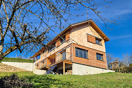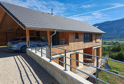 Les propriétaires, l’entreprise de charpente et l’architecte vous proposent une visite d’une maison sur un terrain en pente face à la Chartreuse.