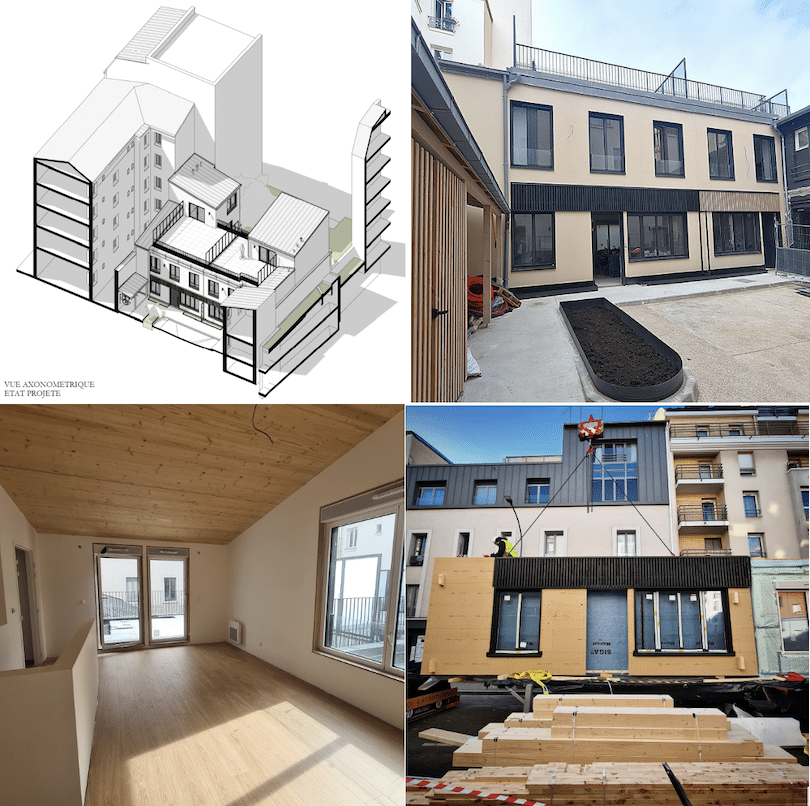 Les maisons jumelles, d’une surface habitable de 135 m2 chacune, présentent un plan symétrique. Un patio partagé permet de créer de nouvelles vues et de distribuer un plan traversant nord/sud. Un vaste séjour cuisine ouvert au rez-de-chaussée jouis d’une hauteur sous plafond généreuse. A l’étage, le plan rend possible l’aménagement de trois chambres avec salle d’eau privative ou bien d’une grande salle de bain. Au dernier niveau, l’accès à la toiture terrasse se fait par un espace favorable au télétravail dans des conditions agréables. L’ensemble de l’enveloppe et de la structure ont été réalisée en préfabrication hors-site dans l’atelier de l’entreprise Xylo située dans le Doubs et montée sur site en cinq jours par grue mobile par le charpentier Castillon. Les panneaux de façade en ossatures bois ont été livrés avec les menuiseries extérieures déjà posées. Les planchers se composent de caissons CLT remplis de grains en carbonate de calcium naturel afin de renforcer le confort acoustique entre étages. L’isolation entre montants d’ossatures bois ainsi que l’isolation extérieure sous enduit est composée de panneaux de fibre de bois.