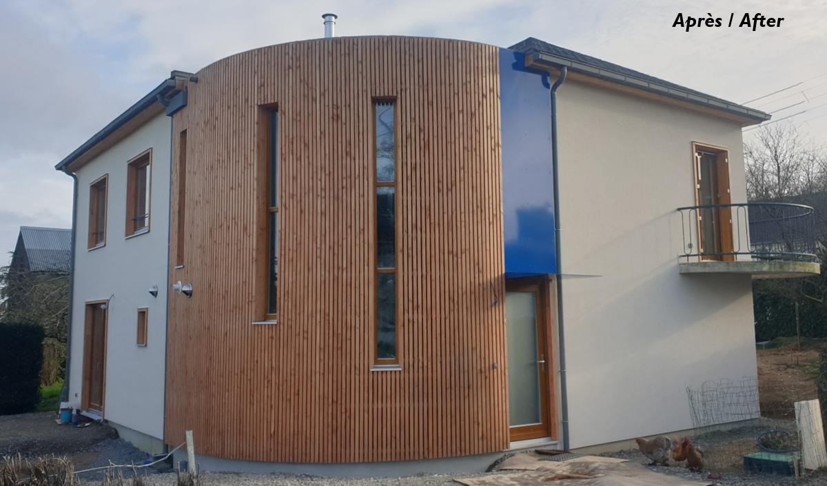 Située à deux pas du bourg de Savenay, cette maison des années 1950 a fait l’objet d’une rénovation lourde permettant d’atteindre le standard PassivHaus en rénovation (labellisée EnerPhit).