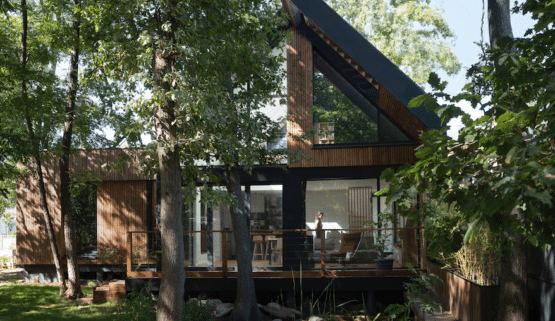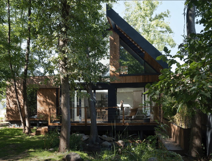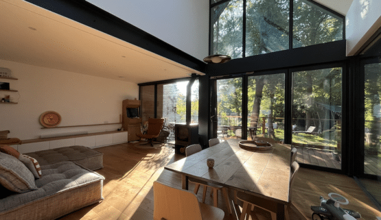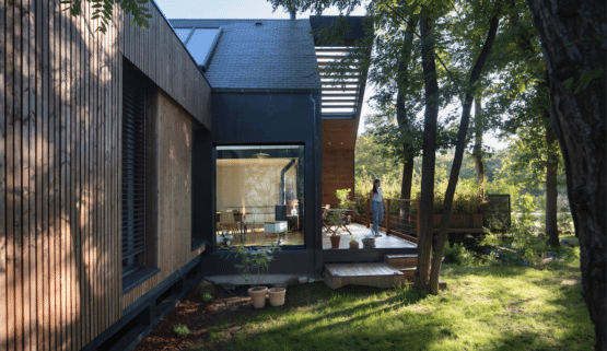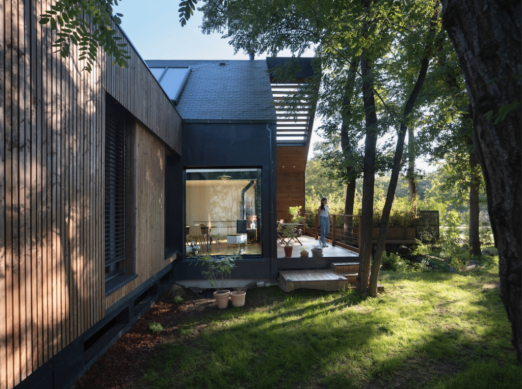 La maison se compose de deux volumes sur pilotis. Ainsi les EP peuvent continuer de s’infiltrer sous l’emprise de la maison ont permis de protéger les racines des chênes pendant la construction. L’impact environnemental est réduit car la construction nécessite peu de terrassement, préservant ainsi l’écosystème naturel. Toitures végétalisées expansives sur le toit plat et le débord devant l’entrée. Maison à ossature bois, isolant fibre de bois et ouate de cellulose. Utilisation enduit à la chaux et enduit terre. Peinture BIO.
