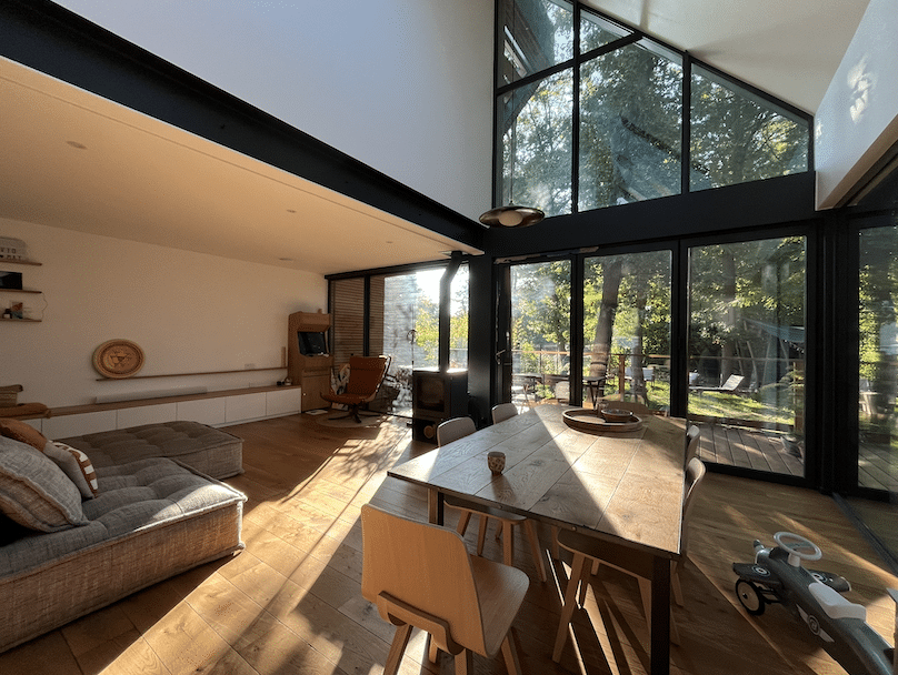 L’intégration de la maison dans son environnement et la conservation d’un maximum d’arbres ont été une priorité et un combat tout au long du projet.